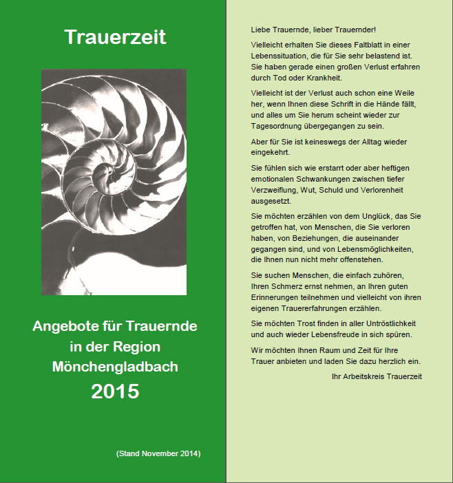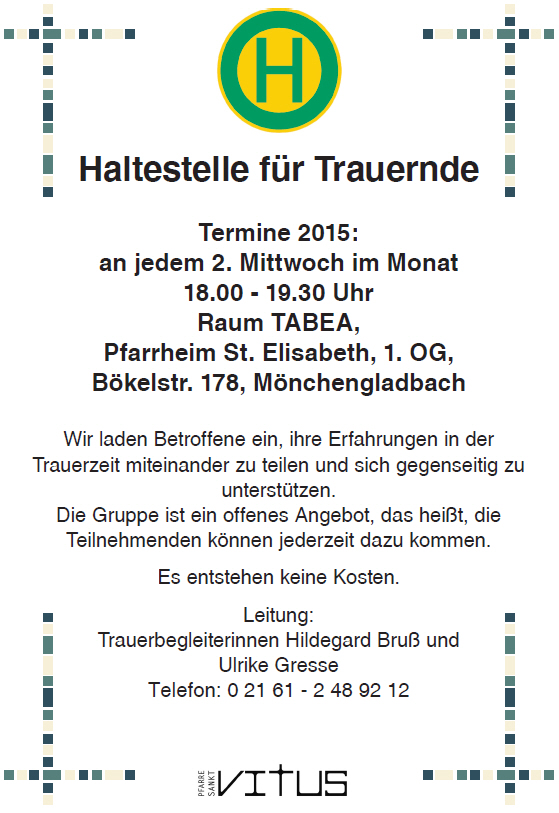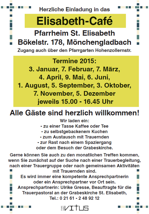 Ansprechpartnerin: Ulrike Gresse Gemeindereferentin, Beauftragte für die Trauerpastoral an der Grabeskirche St. Elisabeth Telefon: 0 21 61 - 2 48 92 12 E-Mail: ulrike.gresse@pfarre-sankt-vitus.de Internet: www.trauerseelsorge-elisabeth-mg.de ![]() |