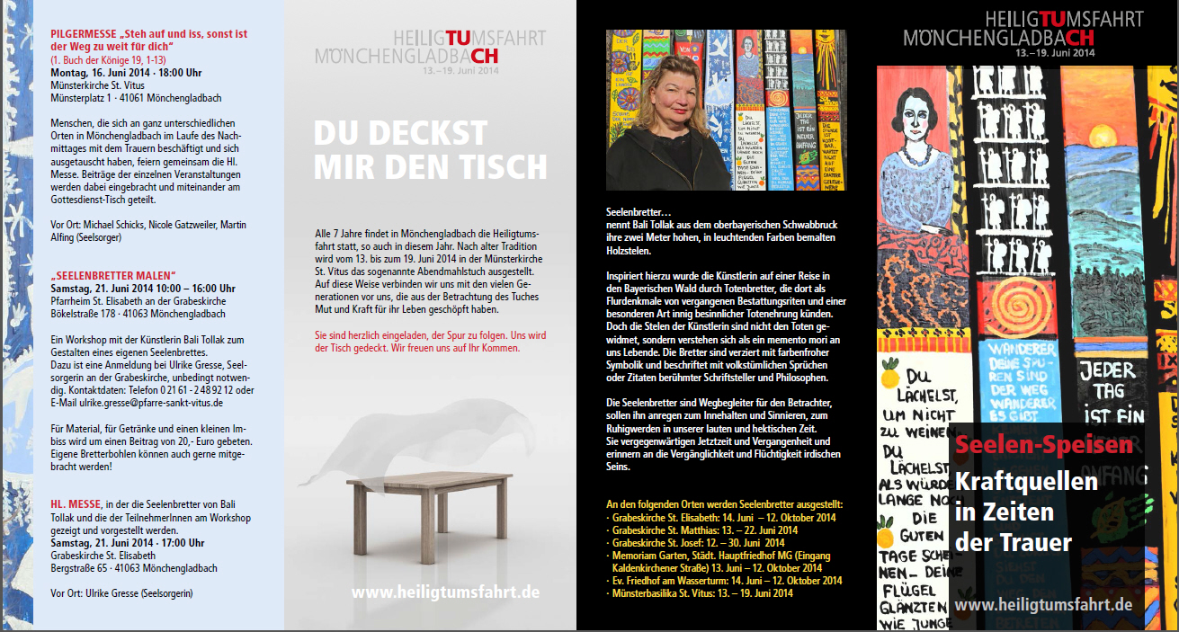 - Kraftquellen für Trauernde Mönchengladbach, 19. Mai 2014 In der Region Mönchengladbach machen im Rahmen der Heiligtumsfahrt 2014 unterschiedliche Institutionen und Verantwortliche am 16. Juni auf ihre "Kraftquellen für Trauernde" aufmerksam. Unter der Leitung von Ulrike Gresse, Gemeindereferentin und Trauerbegleiterin, ist ein Tagesprogramm entstanden, bei dem sich Unterstützerinnen und Unterstützer für Trauernde vorstellen und auf ihre Begleitangebote aufmerksam machen. Den Rahmen - und gleichzeitig das gemeinsame Erkennungszeichen - schaffen die "Seelenbretter" von Bali Tollak, die an den Veranstaltungsorten auch über den Tag hinaus ausgestellt sein werden. Diese Orte erleben Betroffene vor allem auch als Begegnungsorte: die Grabeskirchen in Eicken, in Günhoven und Viersen, den evangelische Friedhof am Wasserturm, den Memoriam Garten auf dem städtischen Friedhof und die Krypta des Münsters. Im Pfarrheim St. Elisabeth, im Elisabeth-Café, stellen zudem die Initiativen "Schmetterling Neuss e.V.", die Gruppe "Verwaiste Eltern" und das DRK ihre Begleitangebote für Trauernde, besonders auch für Kinder und Jugendliche, vor. Allen Engagierten gemeinsam ist die Sorge für Menschen in den unterschiedlichen Trauersituationen und der Wunsch, deren Ressourcen zu stärken. |