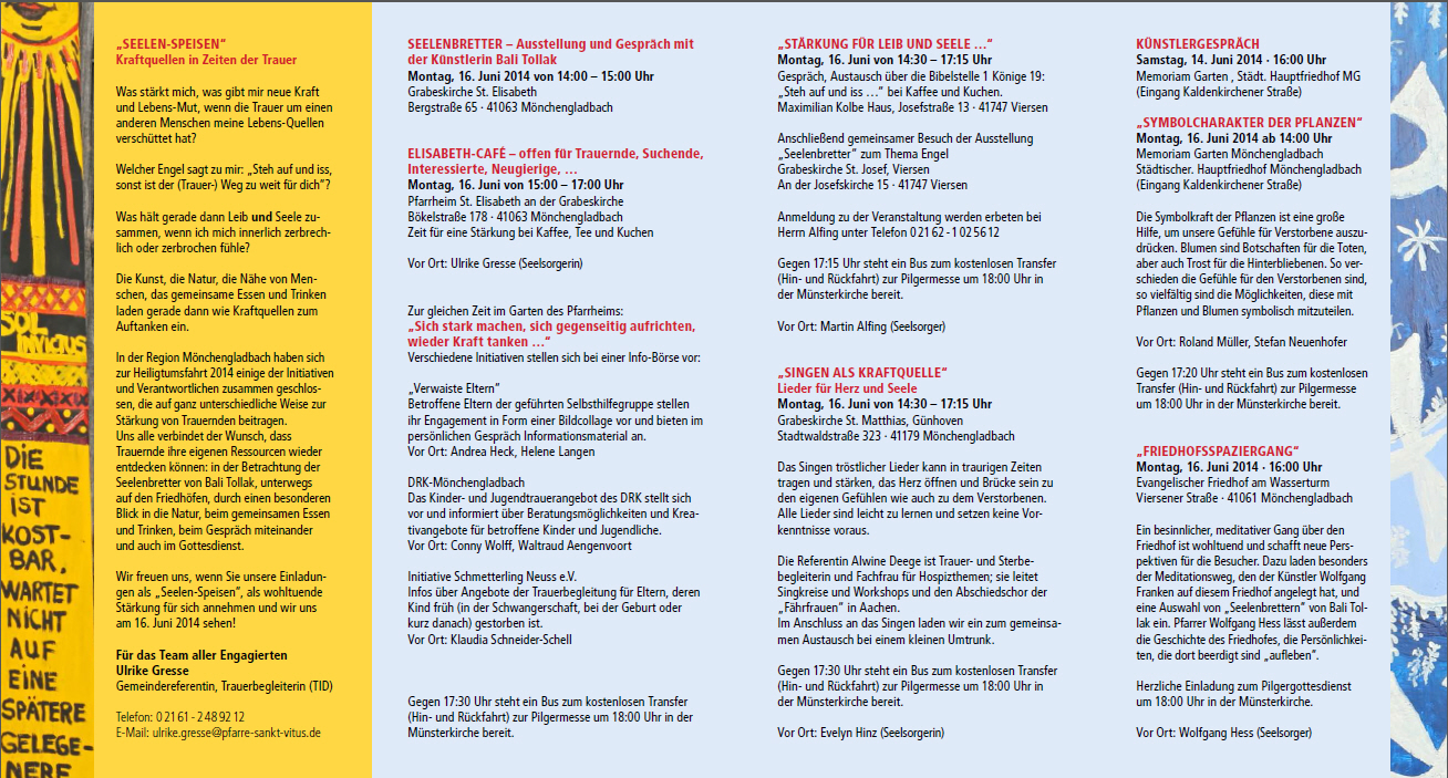 Programm und alle Ausstellungsorte: nachlesbar unter: www.grabeskirche-mönchengladbach.de www.heiligtumsfahrt-mg.kibac.de/alle-veranstaltungen Rückfragen: per Mail: u.gresse@gmx.de, Telefon: 02165/ 8799897 |